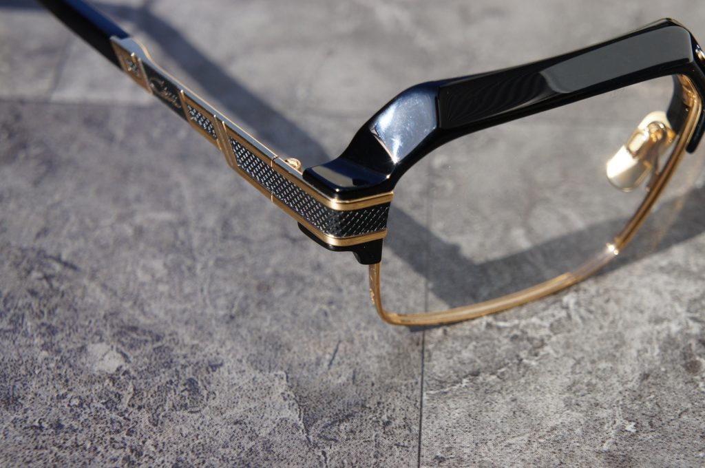 さらに、立体感のあるスクエアシルエットに、幾何学的なテンプルデザインを組み合わせることで、横顔にまで洗練された存在感を演出。