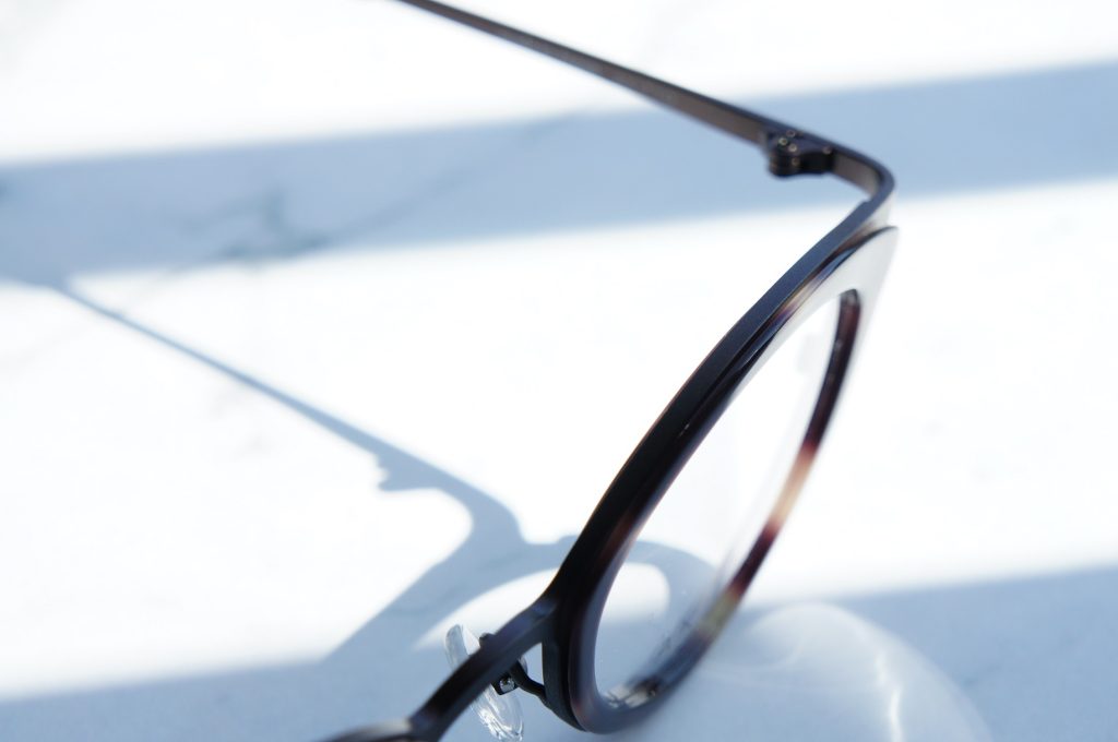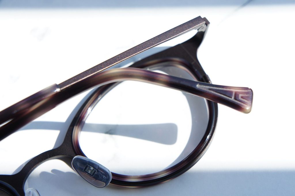 2mm厚のチタンとインナーアセテートを組み合わせたコンビネーションフレームで、目元を上品に彩ります。